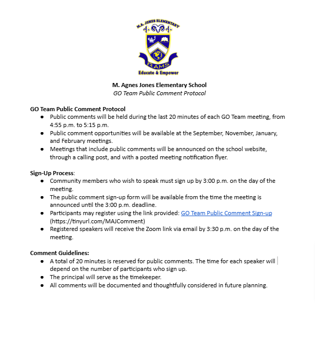 Meeting Date Meeting Time Time Allotted for Public Comment (Yes or No) Link to view virtually (required) & Location if hybrid Meeting Agenda Meeting Summary or Draft Minutes Meeting Recording Presentation & Meeting Documents Approved Minutes 8/18/2025 4:30 PM NO https://tinyurl.com/MAJGOTEAM AGENDA Notes Link PPT Notes 9/11/2025 4:15 PM YES https://tinyurl.com/MAJGOTEAM AGENDA Notes Link PPT Notes 10/09/2025 4:15 PM NO https://tinyurl.com/MAJGOTEAM AGENDA Notes Link PPT 11/13/2025 4:15 PM YES https://tinyurl.com/MAJGOTEAM 12/11/2025 4:15 PM NO https://tinyurl.com/MAJGOTEAM 01/08/2026 4:15 PM YES https://tinyurl.com/MAJGOTEAM 02/10/2026 4:15 PM YES https://tinyurl.com/MAJGOTEAM 03/03/2026 4:15 PM NO https://tinyurl.com/MAJGOTEAM 04/16/2026 4:15 PM NO https://tinyurl.com/MAJGOTEAM GO Team Organization Meeting Notice